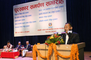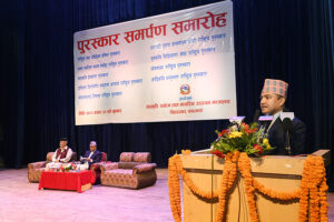 उहाँले पुरस्कार वितरण गर्दै स्रष्टाहरूको योगदानले मुलुकको कला, साहित्य र संस्कृतिको समृद्धिमा महत्वपूर्ण भूमिका खेलेको बताउनुभयो ।