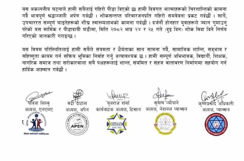 “जेनजी पुस्ताको आह्वानमा देशका विभिन्न स्थानमा भएको प्रदर्शनमा मृत्यु भएकाप्रति नेपाल सरकार गहिरो दुःख व्यक्त गर्दछ । बैठकले मृत्यु भएका व्यक्तिको हकमा सम्बन्धित परिवारलाई राहत उपलब्ध गराउने निर्णय गरेको छ ।