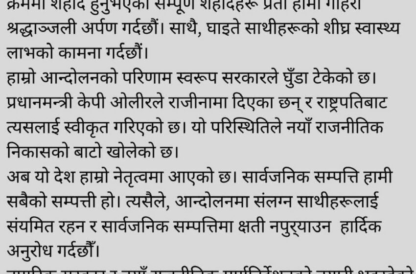 उनले जेन्जीका प्रतिनिधिसहित सबै सरोकारवालासँग वार्तामार्फत् मार्ग खोज्न सकिने विश्वास व्यक्त गर्दै संयमित आह्वान गरेका छन्।