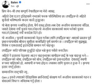 सामाजिक सञ्जालमार्फत अपिल गर्दै उनले भनेका छन्, “देश अहिले फरक परिस्थितिमा छ। तपाईंहरू सुनौलो भविष्यतर्फ कदम चाल्दै हुनुहुन्छ। अन्तरिम सरकारको मुख्य काम निर्वाचन गराउने र नयाँ जनादेश दिलाउने हो। यसका लागि सुशिला कार्की नै उपयुक्त नाम हो।”